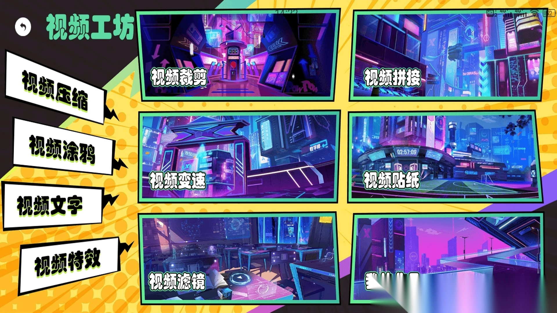 1、视频工坊具备视频裁剪、视频拼接、视频变速、视频贴纸等功能。