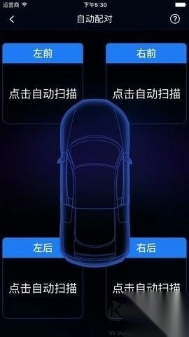 3、自动配对:完成胎压装配后,进入自动配对界面,点击任意一个胎压选项,APP会在60秒内搜索附近胎压发出的用于匹配的蓝牙信号,搜索到后即配对成功。