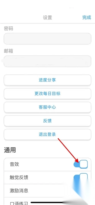 3、进入设置页面,在列表里找到音效、触觉反馈、激励消息以及口语练习,点击对应的关闭或开启按钮就能完成操作。