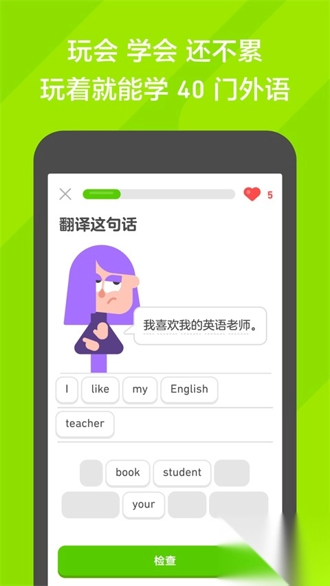 一边掌握新单词、短语和语法,一边赚取虚拟货币、解锁冲关还有提升语言熟练度