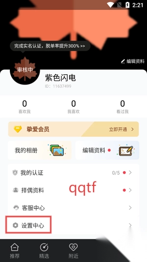 打开你的挚爱婚恋App,在个人中心点击设置功能。