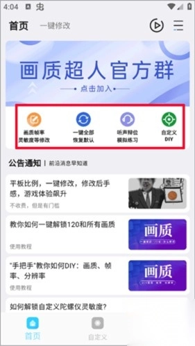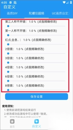 2、进入【自定义】选项,可手动调整画质参数,如画质DIY、陀螺仪超频、UC画质自定义,适配不同设备需求。