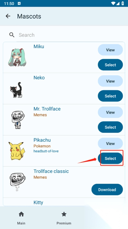 2、接下来,挑选一个自己心仪的桌宠,然后点击“Select”。需要注意的是,“Select”按键只有在下载桌宠之后才会显示。要是没有看到“Select”按键,点击“Download”按键进行下载,下载完成后“Select”按键就会出现了。