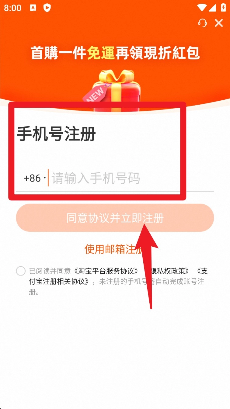 1. 首次进入 App 后,会弹出手机注册页面,输入手机号并点击「同意协议并立即注册」。