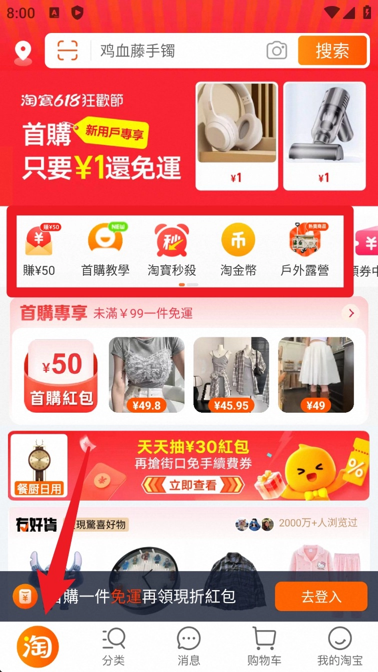 3. 成功登录后自动跳转首页,点击首页中部横幅「首购再领红包」进入新人专享活动。