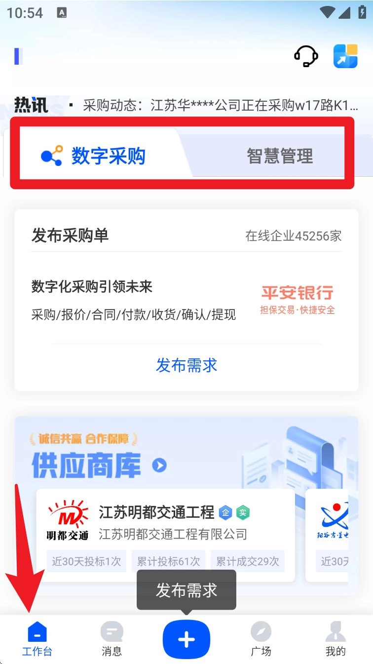 3. 成功登录后,会进入首页的“工作台”页面,在此页面能够切换数字采购、智慧管理等功能模块。