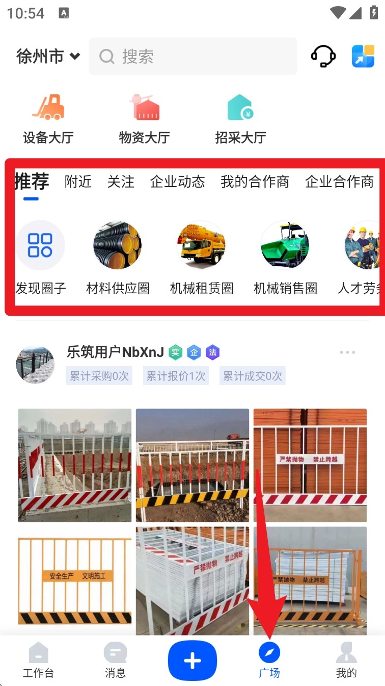 4. 点击下方的“广场”页签,就能浏览行业圈子,同时还能关注企业动态与合作信息。