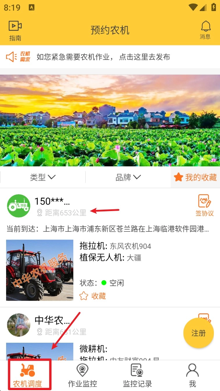 3. 点击下方“农机调度”模块进入设备调配界面,浏览可预约农机并查看距离与状态。