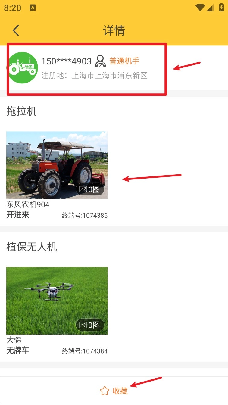 4. 点选任意农机设备可查看详细信息、驾驶员资料及配套机具列表,支持一键收藏。