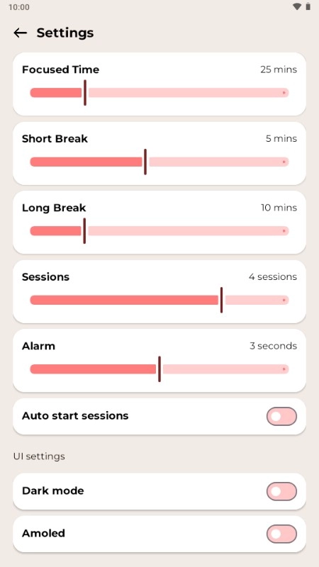 1. 用户可自行设定所需的工作时间、短休息时间以及长休息时间。