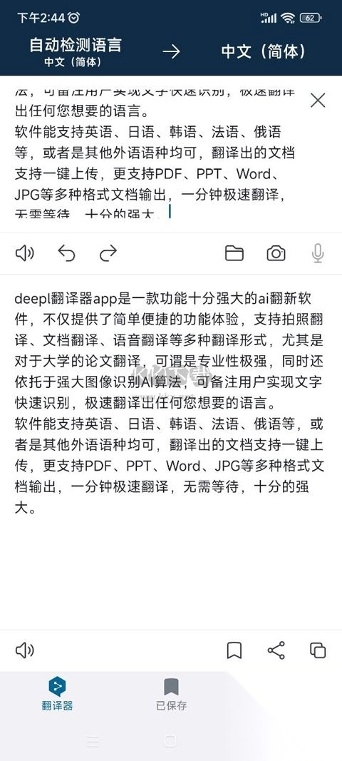 DeepL翻译器APP安卓版是一款具备强大翻译能力的软件。该软件支持多种翻译模式,用户可输入文本实现文本翻译。在翻译时,它能为用户提供各类翻译词汇的解释,助力用户更优质地理解翻译句子。而且,它还支持实时翻译功能,用户在搜索语句时,软件便能同步翻译相关语言。此平台运用强大的安全保护机制,可保护用户翻译的每一份数据。不仅如此,它还提供众多个性化功能,用户能依据自身需求添加并使用各种功能。