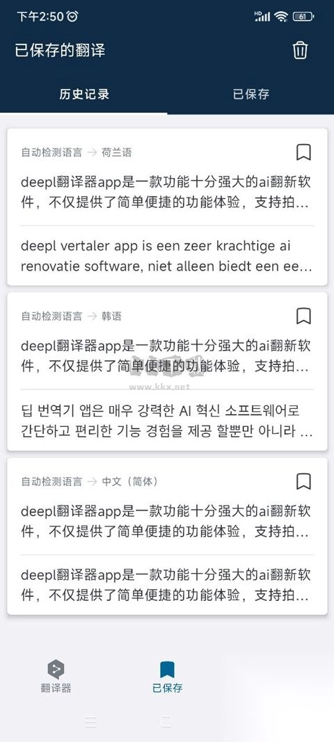 6、还支持用户查看翻译的历史记录并进行删除和保存操作。