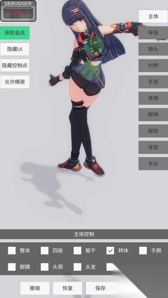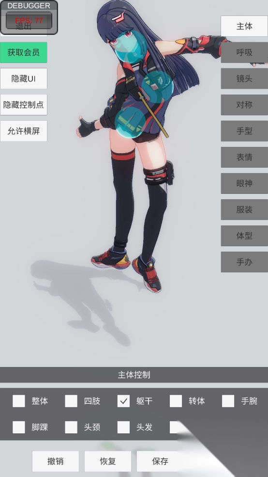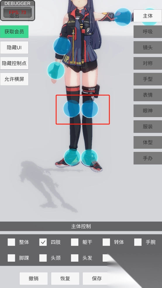 1、在角色模型方面,蓝色的球能够操控模型整体进行向上或向下的移动。