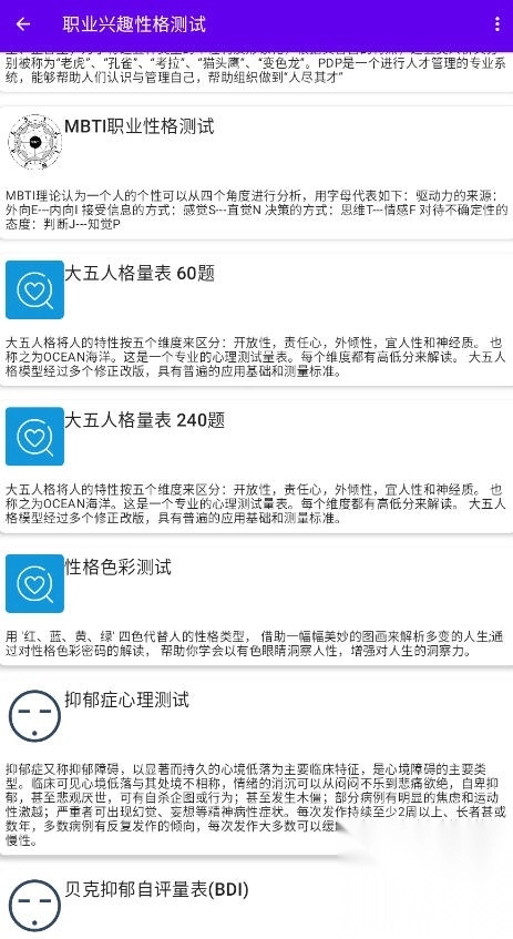 涵盖霍兰德职业兴趣量表、MBTI性格类型、DISC性格分析、智商测试、情商测试及社恐测试等,全面覆盖职业与性格评估需求。