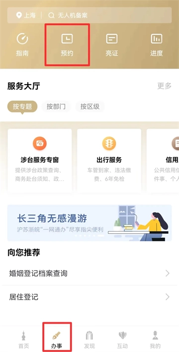 01第一步登录“随申办市民云”APP,选择主页下方的【办事】栏目,点击【预约】选项。