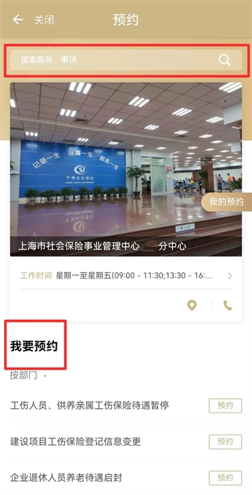 02. 第二步:在搜索栏输入您打算前往办事的机构名称,例如:上海市社会保险事业管理中心XX分中心,选择之后进入预约界面。