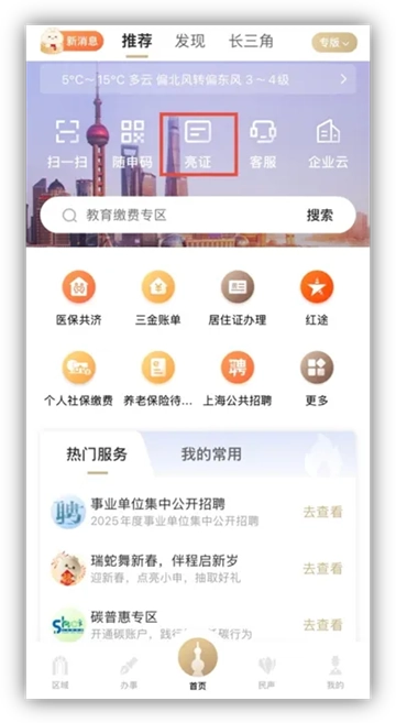1、登录“随申办市民云”APP,点击“亮证”;