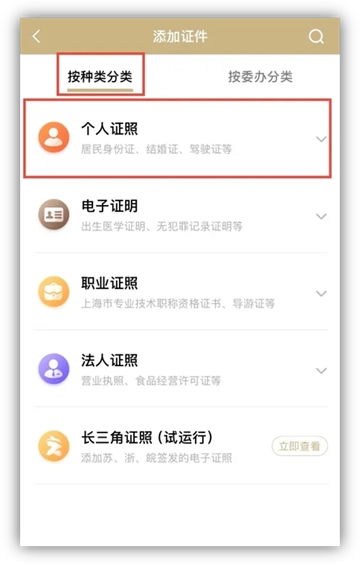 2、在“亮证”界面选择“个人”,点击下方“添加证照”;