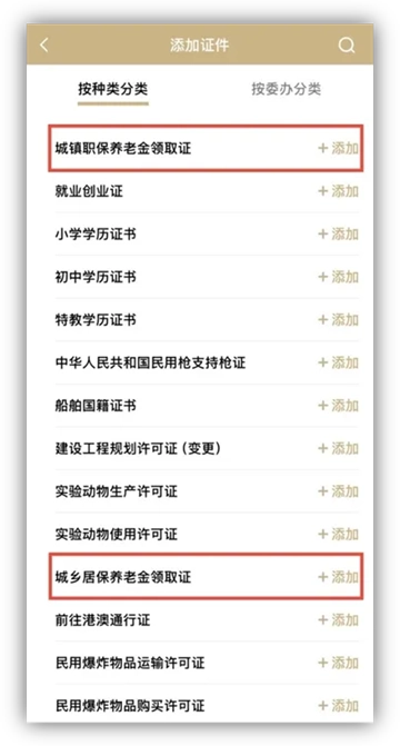 3、找到并点击“个人证照”,从中查找“城镇职保养老金领取证”或者“城乡居保养老金领取证”,找到后点击“添加”就可以了。