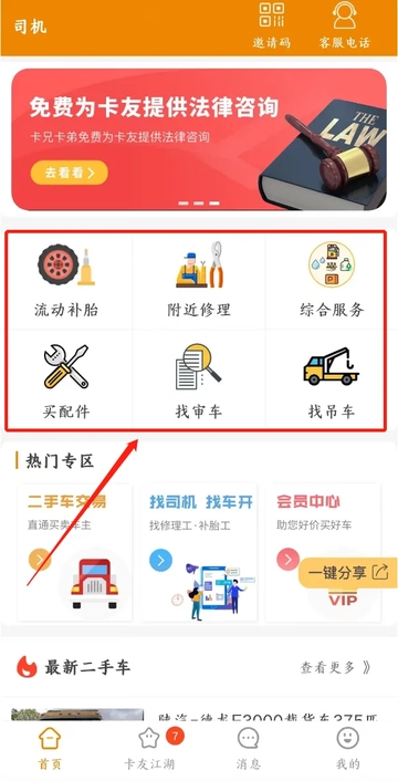 【主页】提供丰富服务:流动补胎、附近修理、配件购买、综合服务、审车协助、吊车找寻,全方位解决您路途中的各类难题。同时开展二手车交易,助您以理想价格买卖二手车。此外,还有招聘求职服务,帮您解决招司机不易、找活困难的困扰。
