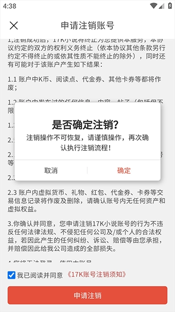 3、勾选“我已阅读并同意《17K账号注销须知》”,点击“申请注销”