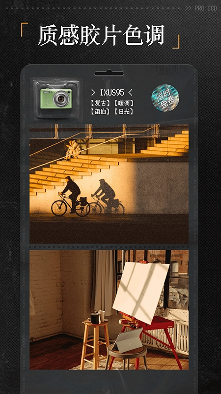 2、受CCD相机启发,精心打造多款复古滤镜,包括浓郁色彩、怀旧褪色、暖调颗粒、清冷日系等不同风格,全方位满足用户对复古风格的多元需求。