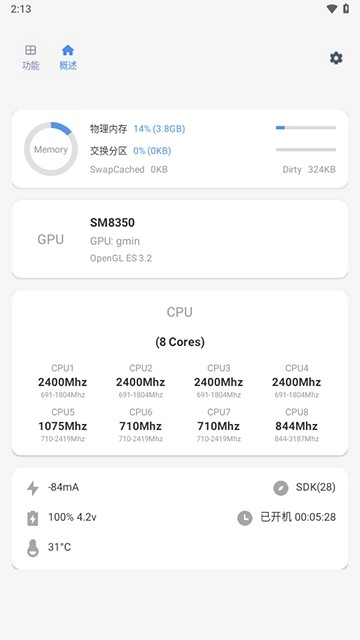 2. 完成选择后,便能进入app主界面。点击“功能”,此处会展示帧率记录、充电统计、耗电统计等功能。
