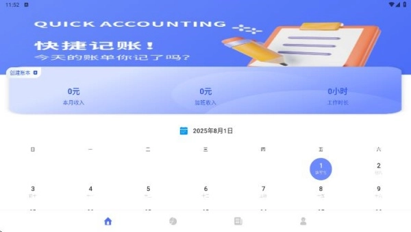 1、首页展示日历,可以更快确定日期来进行账目的添加,快速保存。