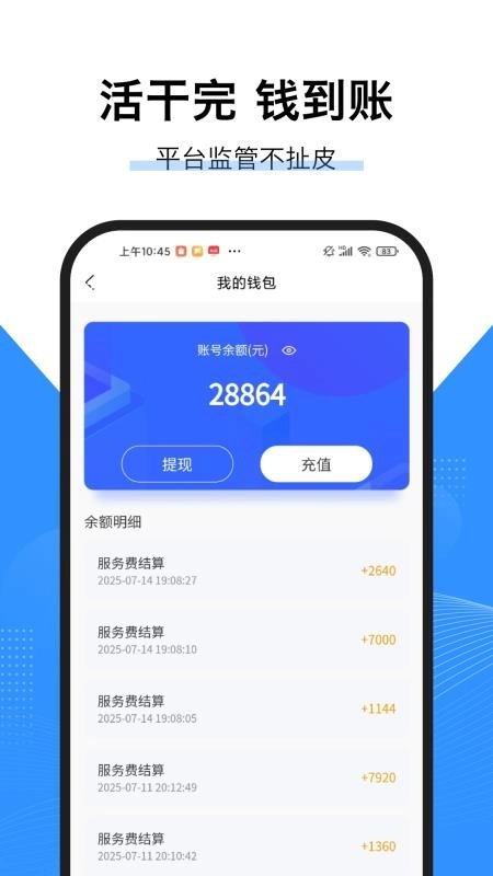 助力用户便捷达成监管交易,使你能够即时缴纳诚信保证金,并通过完成服务任务实现收入的实时结算。