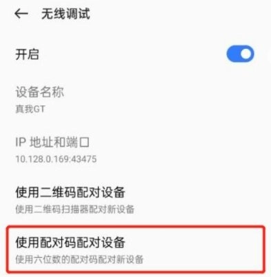 4、在无线调试页面,点击“使用配对码配对”,获得6位数字配对码