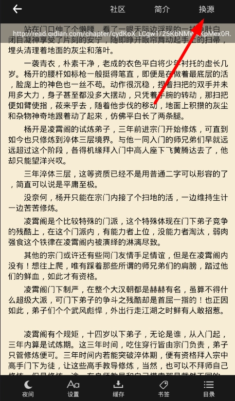 当你准备好开始阅读时,轻触小说阅读界面的屏幕中间位置,待功能菜单弹出后,找到并点击右上角的“切换书源”选项,就能完成小说来源地址的更换。