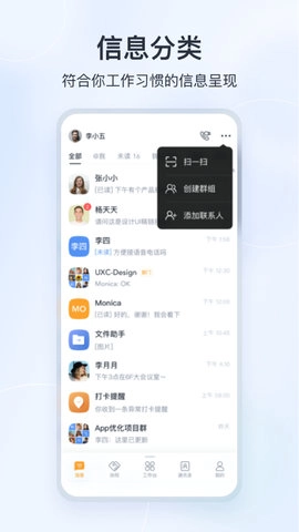 微微工作是一款职场沟通软件,它带来了全新的沟通模式,让聊天更高效便捷。使用微微工作时,你能轻松识别待办事项并添加到日程,从而更好地管理时间与任务。同时,它支持信息数据本地存储和云端同步,让你可随时随地查看聊天记录,实现沟通无缝衔接。