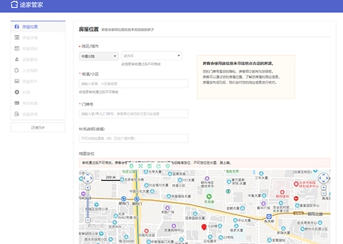 5、用户需依次填写房屋位置、房屋详情、房屋描述、设施服务、入住规则、房屋照片、价格、身份验真、房屋资质等相关内容。
