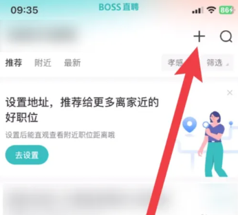 打开BOSS直聘应用,待进入主界面后,在屏幕右上角找到添加(+)按钮并点击。