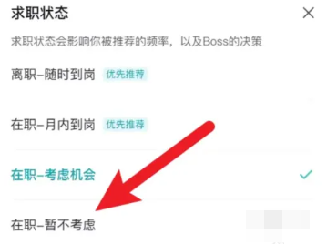 最后,于弹出的求职状态选项菜单里,选取“在职-暂不考虑”,以此更新你的求职状态。