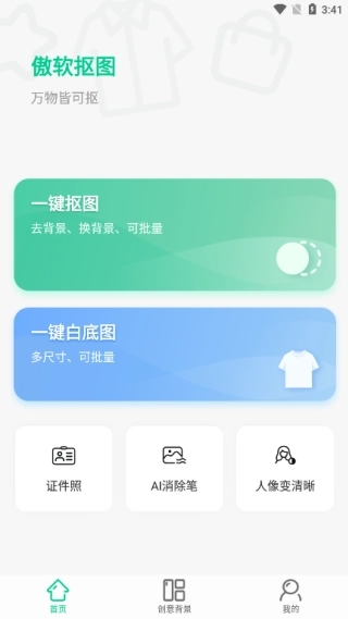 1、首页配备了一键抠图、一键生成白底图、证件照制作、消除笔、人像清晰度提升等功能。