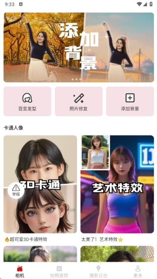 1、相机功能里配备了百变发型、照片修复、添加背景等实用功能,还包含了丰富多样的美化模板。