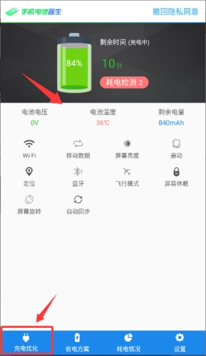 主界面显示电池电压及温度等数据,支持充电优化。