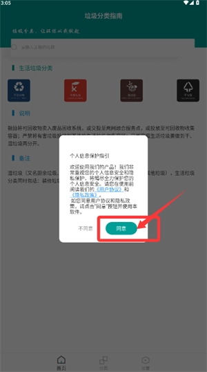 1、启动垃圾分类应用,阅读个人信息保护指引,点击同意进入。