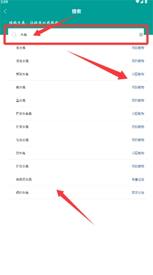 4、在搜索框输入特定垃圾名称如"水瓶",即时获取分类信息。