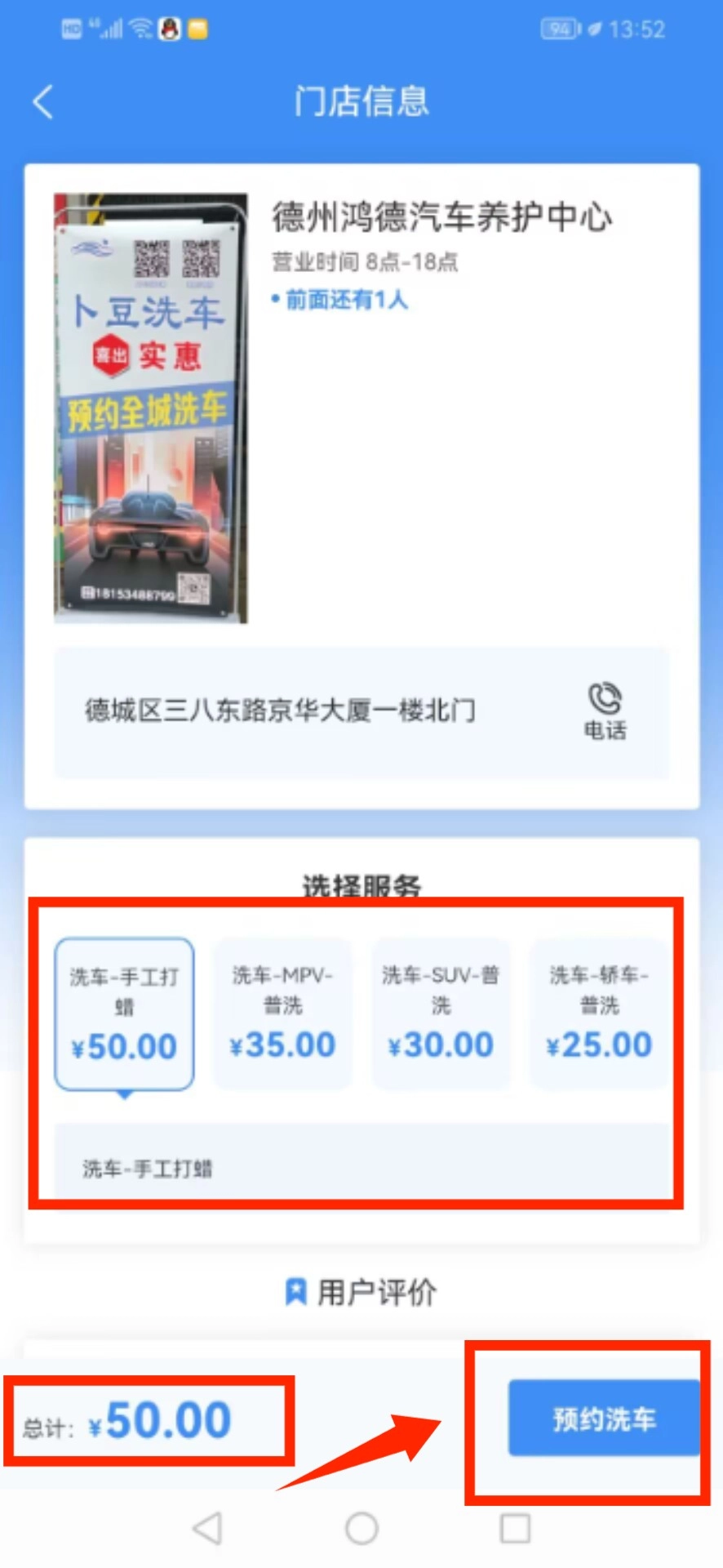 挑选服务项目并确认价格后预约洗车。