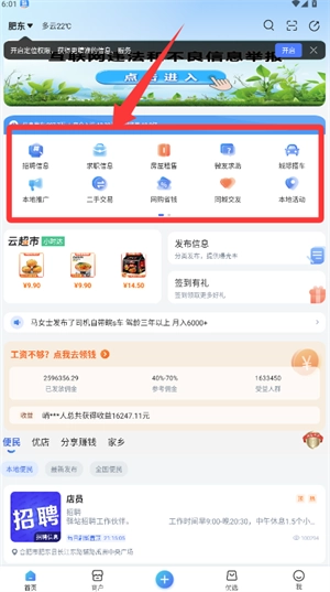 首页设有招聘求职及各类生活服务的入口,用户可根据自身需求选择使用。