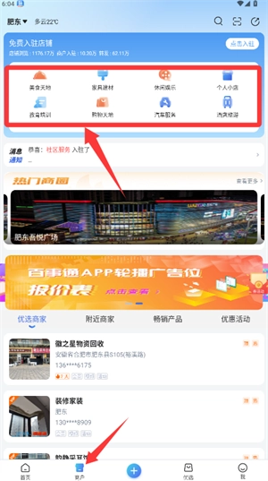 切换至商户板块可浏览美食、家居等不同行业分类。