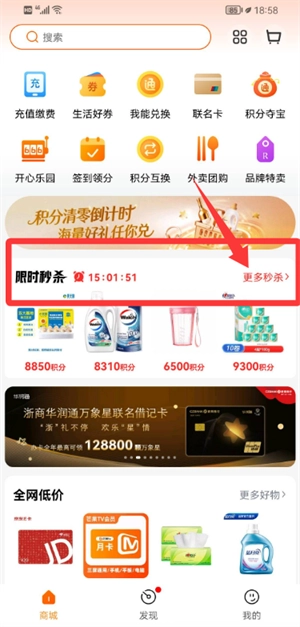 进入商城首页后,找到限时秒杀专区并点击查看更多活动商品。