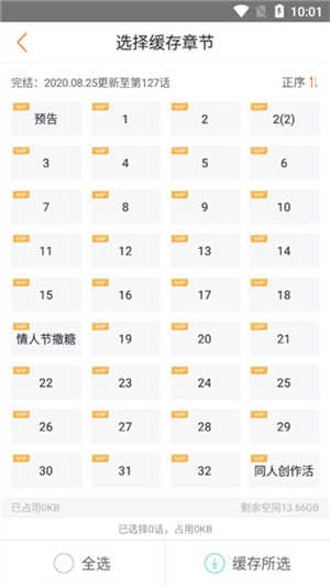 挑选想要缓存的章节,点击右下角的“所选”按钮就能完成漫画缓存,以便进行离线阅读。
