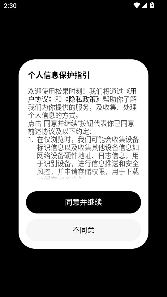 首先打开软件,阅读“个人信息保护指引”,随后点击“同意并继续”按钮进入下一步。