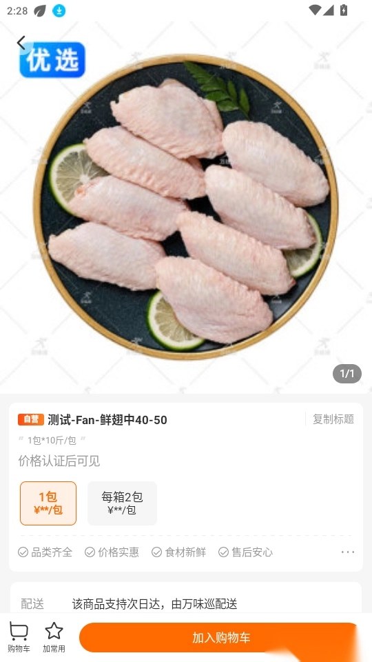 进入食材商品的详情页面后,点击“加入购物车”按钮,就能把该商品添加到购物车中进行管理。