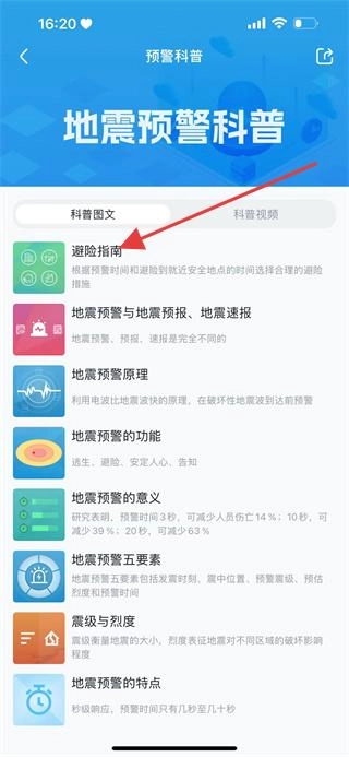 2、点击“预警科普”选项,即可进入地震预警科普页面,在该页面中能够查看科普图文等相关内容。