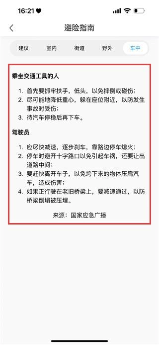 3、点击“避险指南”选项,进入对应的页面后,就能查看针对不同场景给出的避险建议。