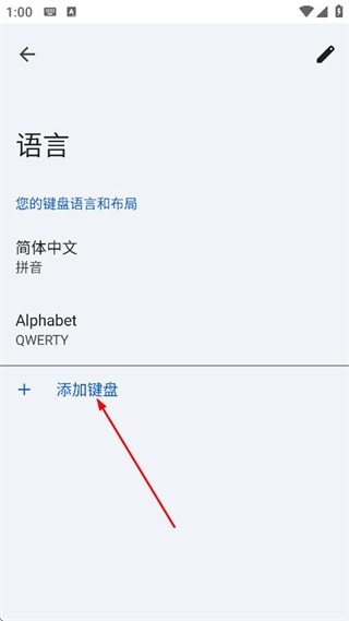 在语言设置界面,选择添加键盘选项,即可跳转至添加键盘的页面。